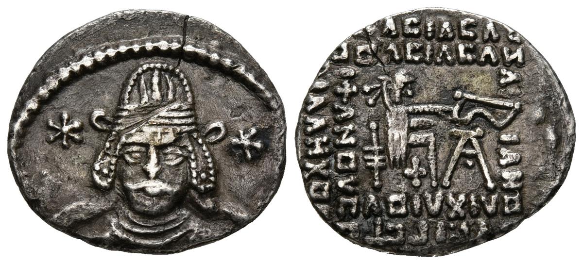 REYES DE PARTIA, Meherdates. Dracma. (Ar. 3,02g/21mm). 49-50 d.C. Ekbatana. (Sellwood 67.1). Anv: Busto de frente con tiara entre dos estrellas. Rev: Arquero sentado a derecha, debajo del arco monograma. MBC.