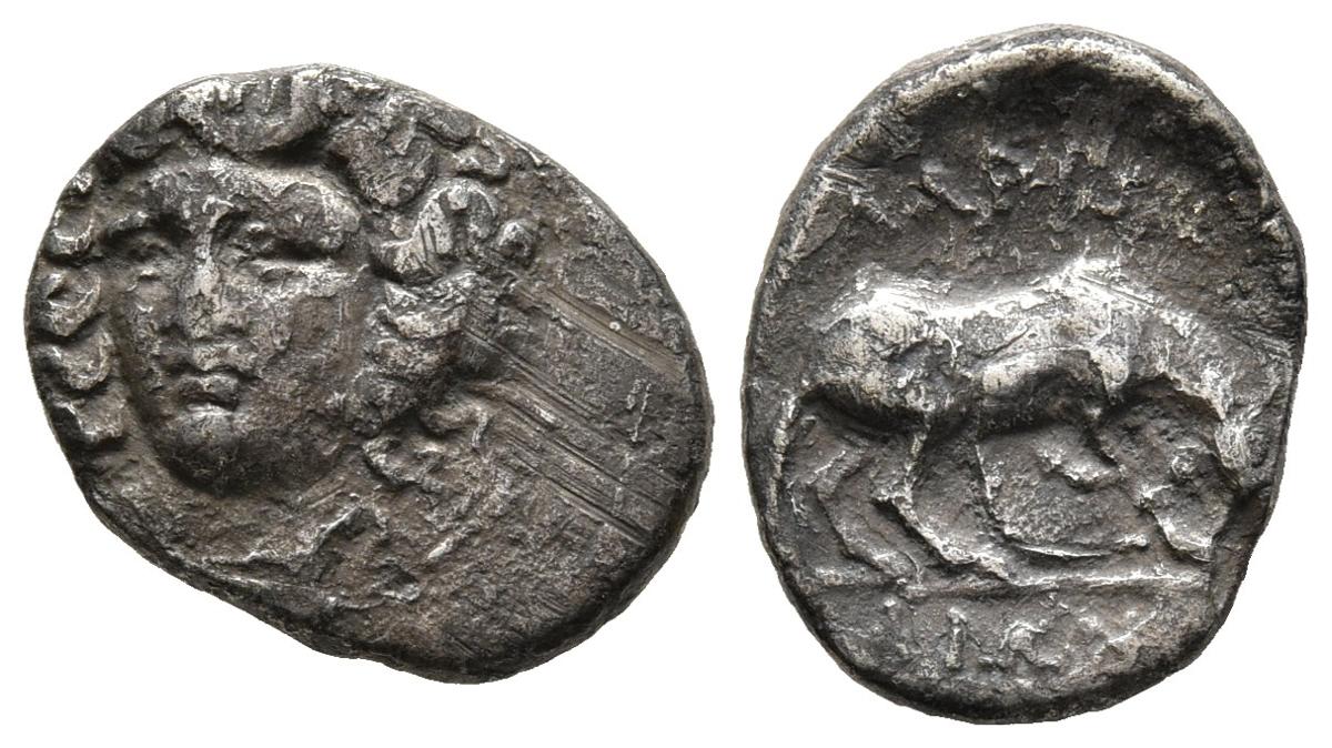 TESALIA, Larissa. Hemidracma. (Ar. 1,99g/16mm). 356-342 a.C. (HGC 6, 464). Anv: Cabeza de la ninfa Larissa de frente a izquierda. Rev: Caballo inclinándose a izquierda, alrededor leyenda griega. MBC-. Descentrado.