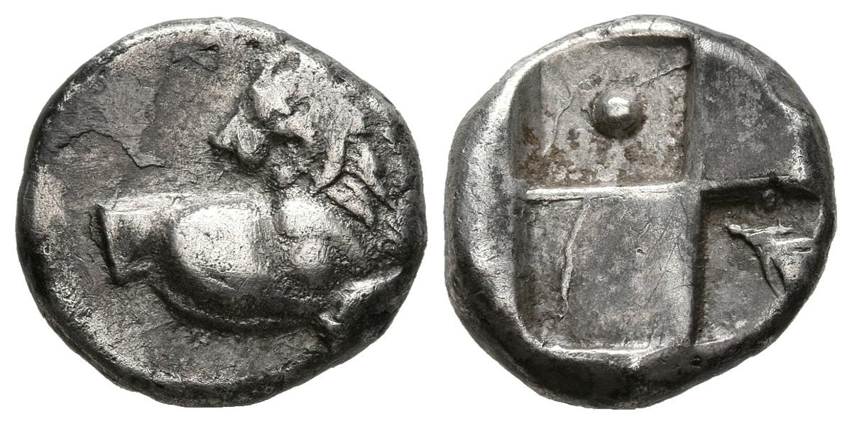 TRACIA, Chersonesos. Hemidracma. (Ar. 2,31g/13mm). 400-350 a.C. (Seaby 1607). Anv: Parte delantera de león a izquierda. Rev: Cuatripartito incuso con punto en primer cuadrante y palma en el cuarto cuadrante. MBC.