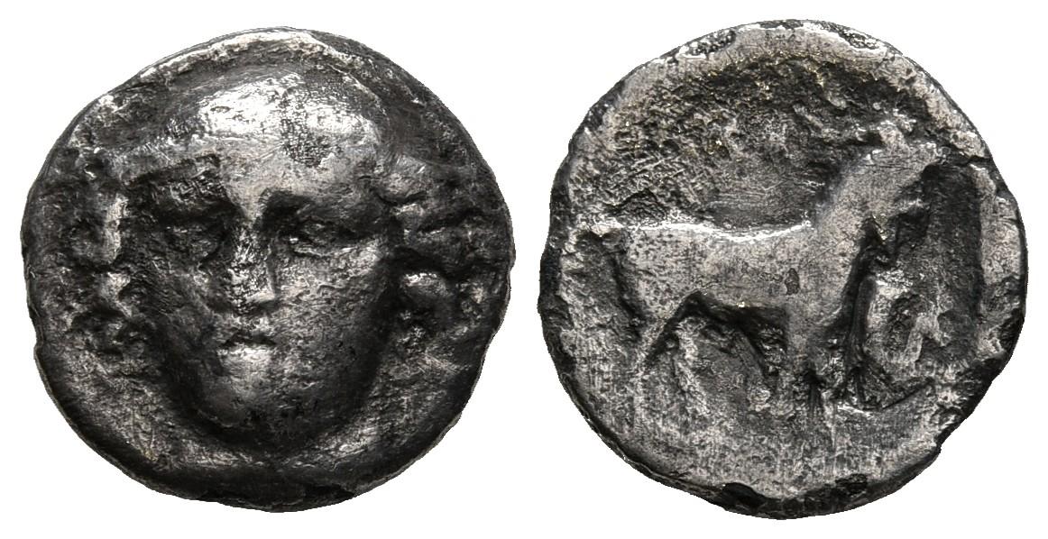 TRACIA, Ainos. Tetróbolo. (Ar. 1,81g/13mm). 396-394 a.C. (SNG Copenhagen 412-5). Anv: Cabeza de Hermes de frente a izquierda. Rev: Cabra a derecha, delante ritón, encima leyenda griega. BC+.