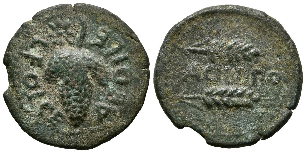 ACINIPO (Ronda. Málaga). As. (Ae. 4,82g/23mm). 100-50 a.C. (FAB-59). Anv: Racimo de uvas, encima estrella de ocho puntas, alrededor leyenda: L FOLCE AEDILE. Rev: Leyenda: ACINIPO, entre dos espigas. MBC+.