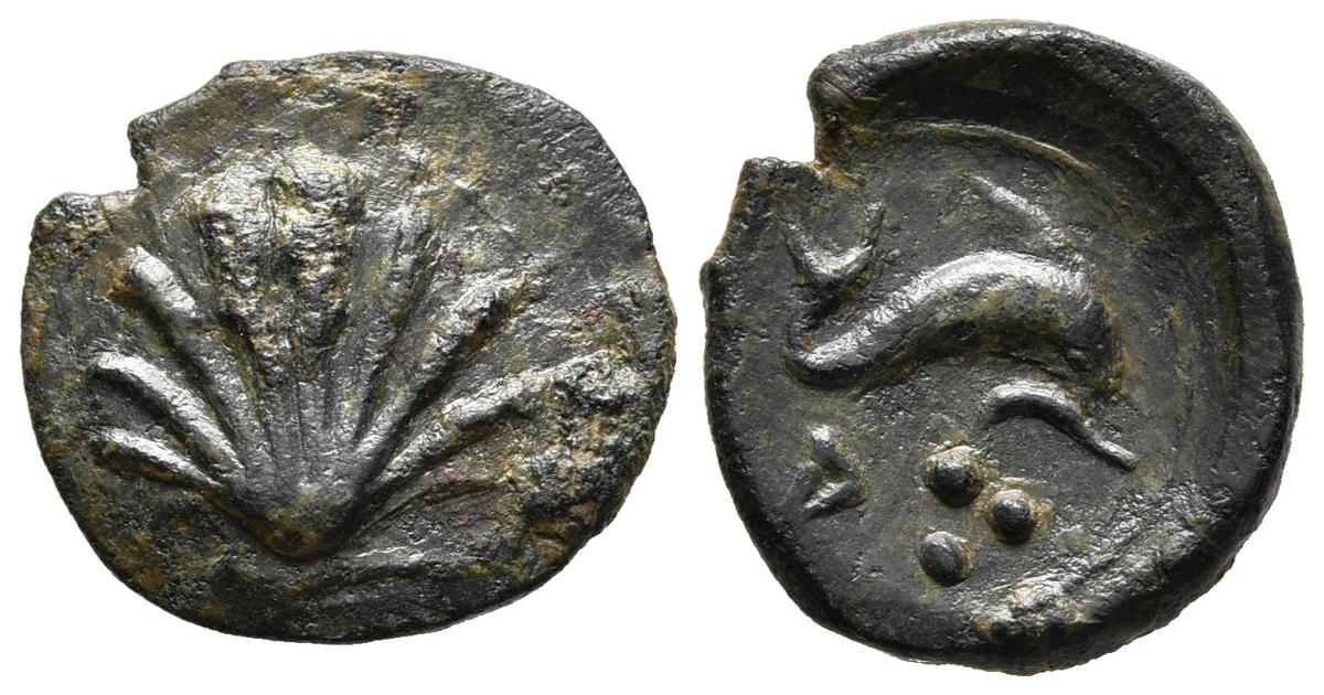 ARSE-SAGUNTO (Sagunto, Valencia). Sextante. (Ae. 2,67g/18mm). 170-20 a.C. (FAB-2055). Anv: Concha. Rev: Delfín a derecha, debajo letra ibérica A y tres puntos. MBC+.