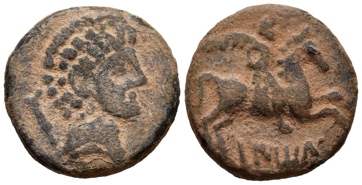 BAITOLO (Badalona, Barcelona). As. (Ae. 9,56g/25mm). 50 a.C. (FAB-190 var). Anv: Cabeza masculina de arte degenerada a derecha, detrás timón. Rev: Jinete con palma a derecha de arte degenerado, debajo leyenda: BAITOLO. MBC. Escaso.