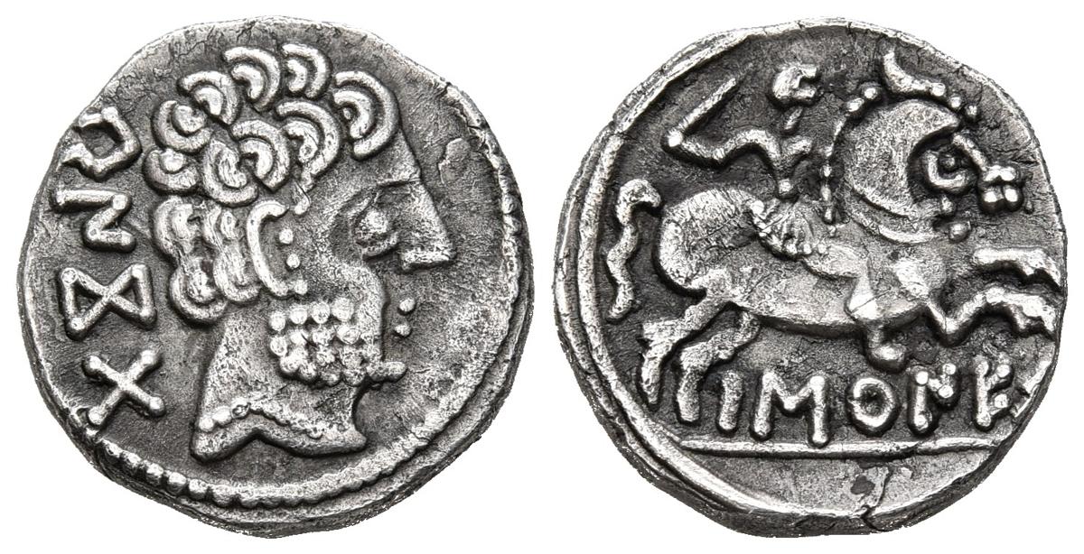 BASCUNES (Pamplona). Denario. (Ar. 3,40g/17mm). 120-20 a.C. (FAB-215). Anv: Cabeza masculina barbada a derecha, detrás leyenda ibérica: BeNCoDa. Rev: Jinete con espada a derecha, debajo leyenda ibérica: BaSCuNES. MBC+.