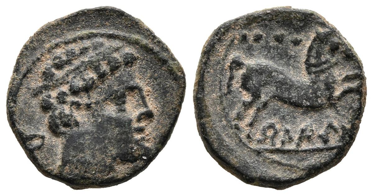 BELIGIOM (Belchite, Zaragoza). Cuadrante. (Ae. 2,74g/16mm). 120-20 a.C. (FAB-248). Anv: Cabeza masculina barbada a derecha, detrás letra ibérica: Be. Rev: Caballo saltando a derecha, encima tres puntos, debajo leyenda ibérica: BeLIGiO. MBC+.