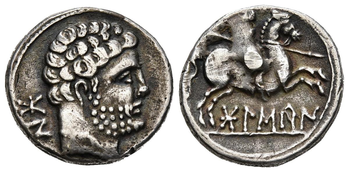 BOLSCAN (Huesca). Denario. (Ar. 3,74g/18mm). 180-20 a.C. (FAB-1912, tipo "Palenzuela"). Anv: Cabeza masculina barbada a derecha, detrás letras ibéricas: BoN. Rev: Jinete con lanza a derecha, debajo leyenda ibérica: BoLSCaN. MBC+. Restos de soldadura en reverso.