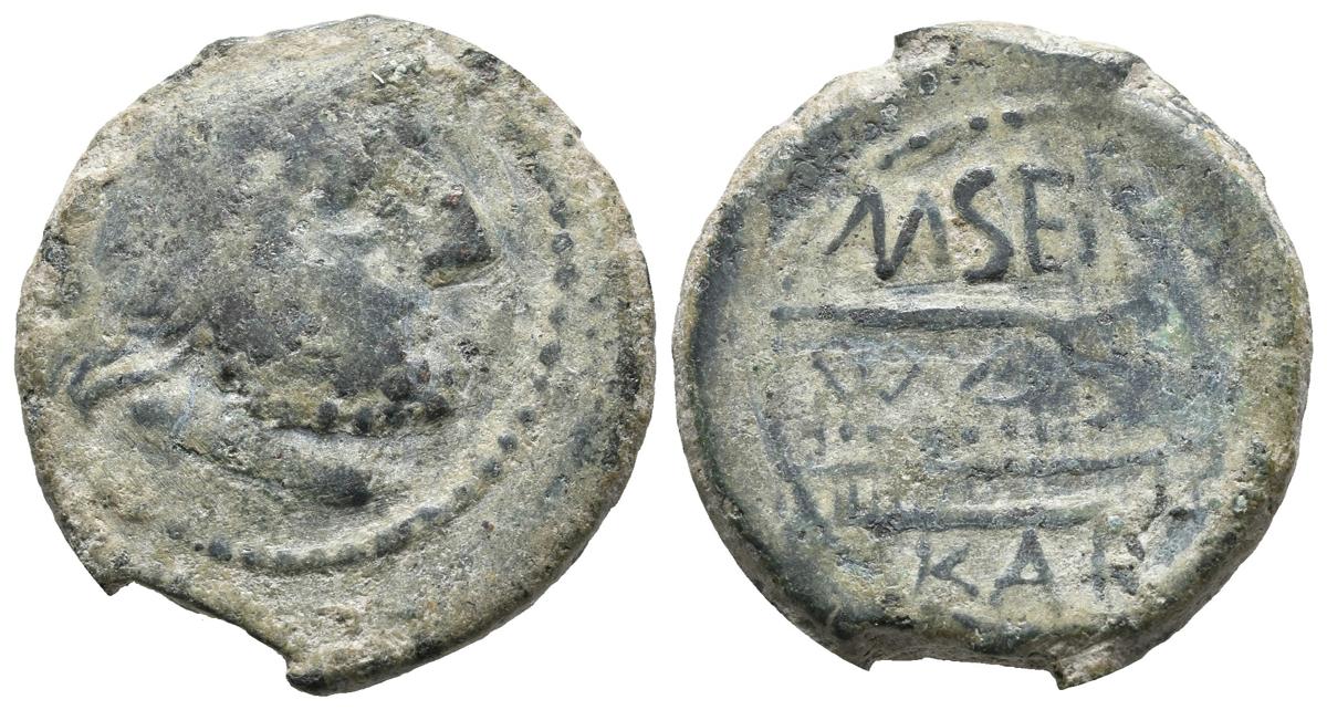CARTEIA (San Roque, Cádiz). Semis. (Ae. 6,20g/22mm). 80-20 a.C. (FAB-624). Anv: cabeza de Júpiter a derecha. Rev: Proa a derecha, encima leyenda: M SEP, debajo: KAR, delante: S. MBC-/MBC.