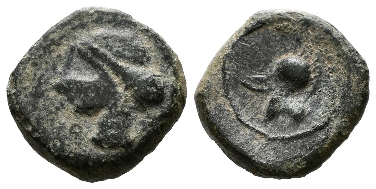CARTAGONOVA (Cartagena, Murcia). 1/4 Calco. (Ae. 1,80g/12mm). 220-215 a.C. (FAB-523). Anv: Cabeza de Atenena a izquierda. Rev: Casco a izquierda. MBC-.