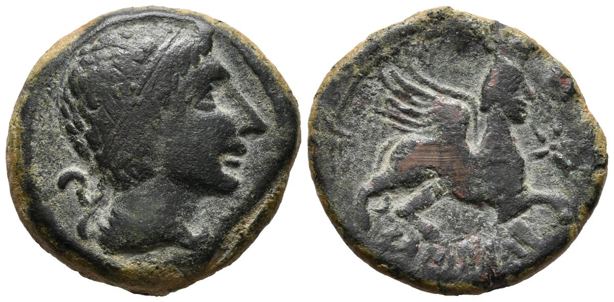 CASTULO (Cazlona, Jaén). As. (Ae. 16,04g/29mm). 180 a.C. (FAB-694). Anv: Cabeza masculina diademada a derecha. Rev: Esfinge a derecha, delante estrella, debajo leyenda curva retrógada: CaSTeLE. MBC. Raspadura en reverso.