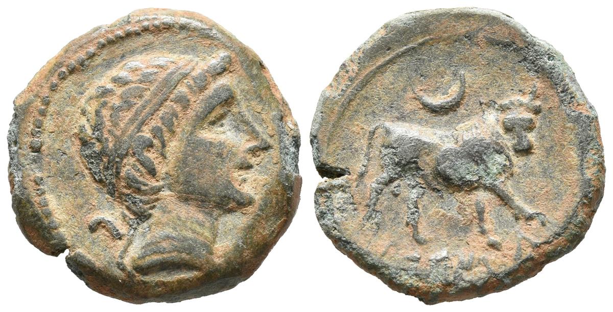 CASTULO (Cazlona, Jaén). Semis. (Ae. 5,77g/21mm). 180 a.C. (FAB-711). Anv: Cabeza masculina diademada a derecha. Rev: Toro a derecha, encima creciente, debajo leyenda ibérica retrógrada: CaSTeLE. MBC+. Bonito ejemplar.