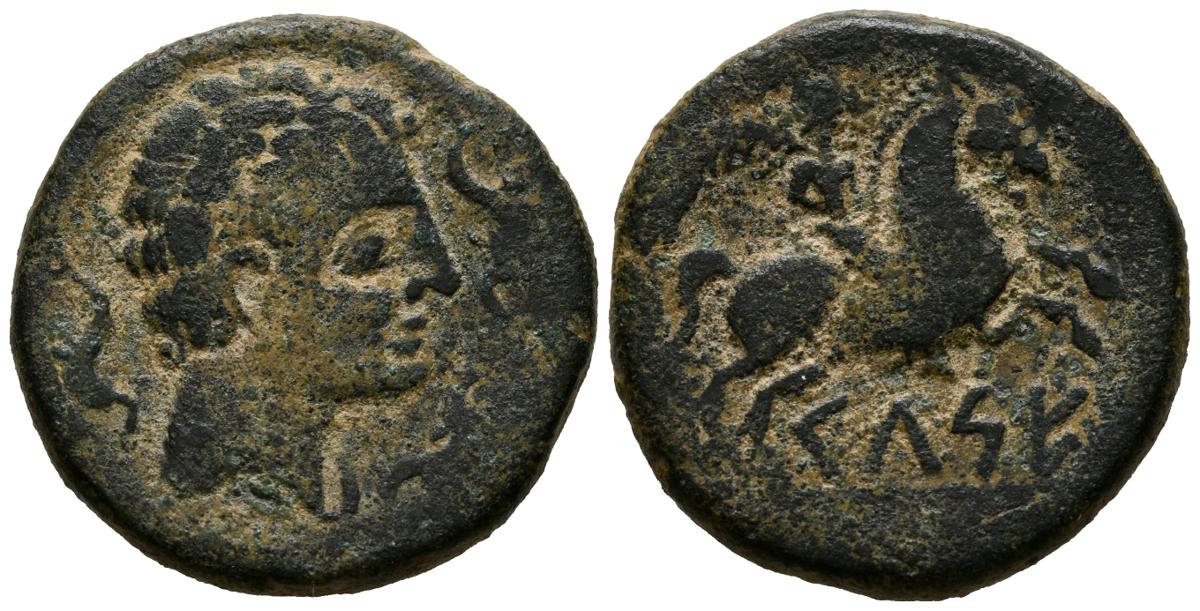 CELSE (Velilla del Ebro, Zaragoza). As. (Ae. 15,83g/30mm). 120-50 a.C. (FAB-771). Anv: Cabeza masculina a derecha con manto y fíbula, alrededor tres delfines. Rev: Jinete con palma a derecha, debajo leyenda ibérica: CeLSE. MBC.