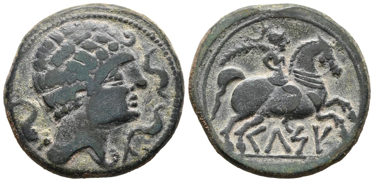 CELSE (Velilla del Ebro, Zaragoza). As. (Ae. 16,71g/30mm). 120-50 a.C. (FAB-771). Anv: Cabeza masculina con manto y fíbula a derecha, alrededor tres delfines. Rev: Jinete con palma a derecha, debajo leyenda ibérica: CeLSE. MBC+.