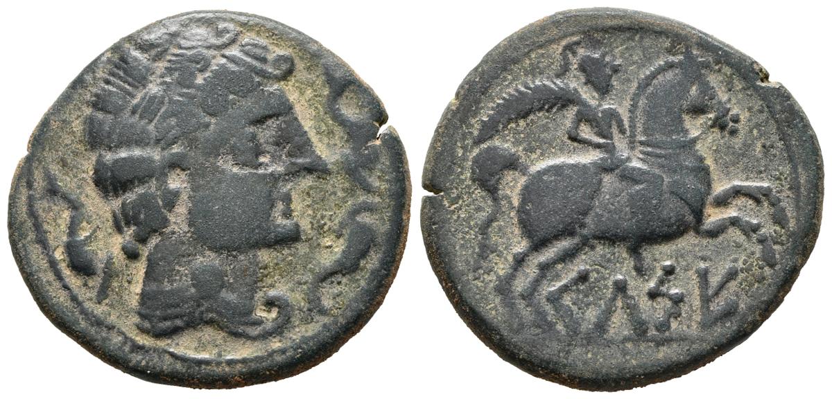 CELSE (Velilla del Ebro, Zaragoza). As. (Ae. 15,86g/30mm). 120-50 a.C. (FAB-771). Anv: Cabeza masculina con manto y fíbula a derecha, alrededor tres delfines. Rev: Jinete con palma a derecha, debajo leyenda ibérica: CeLSE. MBC+.