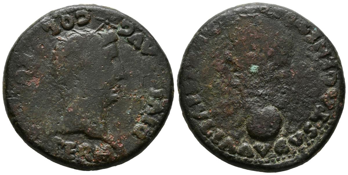 COLONIA ROMULA (Sevilla). Dupondio. (Ae. 25,34g/33mm). 14-36 d.C. (FAB-2014). Anv: Cabeza radiada de Augusto a derecha, delante fulmen, alrededor: PERM DIVI AVG COL ROM. Rev: Cabeza de Livia a izquierda, debajo globo, encima creciente, alrededor: IVLIA AVGVSTA GENETRIX ORBIS. MBC-.