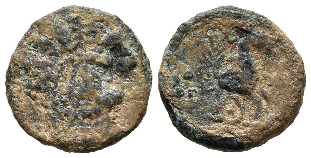 CUELIOCOS (Zona alta del Ebro). Cuadrante. (Ae. 2,52g/16mm). 120-20 a.C. (FAB-874). Anv: Cabeza masculina a derecha. Rev: Prótomo de pegaso a derecha, debajo letra ibérica: Cu y cuatro puntos en forma de cuadrado. BC+.