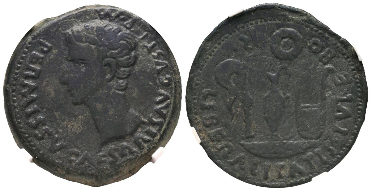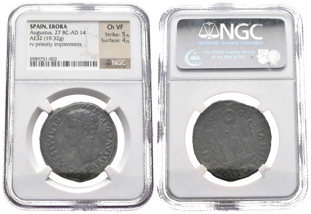 EBORA (Evora, Portugal). Dupondio. (Ae. 19,32g/32mm). 27 a.C.-14 d.C. (FAB-900). Anv: Cabeza de Augusto a izquierda, alrededor leyenda: PERMISSV CAESARIS AVGVSTI P M. Rev: Elementos religiosos: aspérgilo, preferículo, símpulo y pátera, alrededor leyenda: LIBERALITATIS IVL EBORA. MBC+. Rarísimo ejemplar y más en esta preciosa calidad.