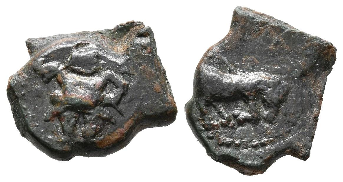EBUSUS (Ibiza). Divisor de 1/8 Calco. (Ae. 0,33g/8mm). 200-100 a.C. (FAB no cita). Anv: Bes con faldellín de frente sosteniendo martillo y serpiente. Rev: Bes con faldellín de frente sosteniendo martillo y serpiente. MBC. Muy raro.