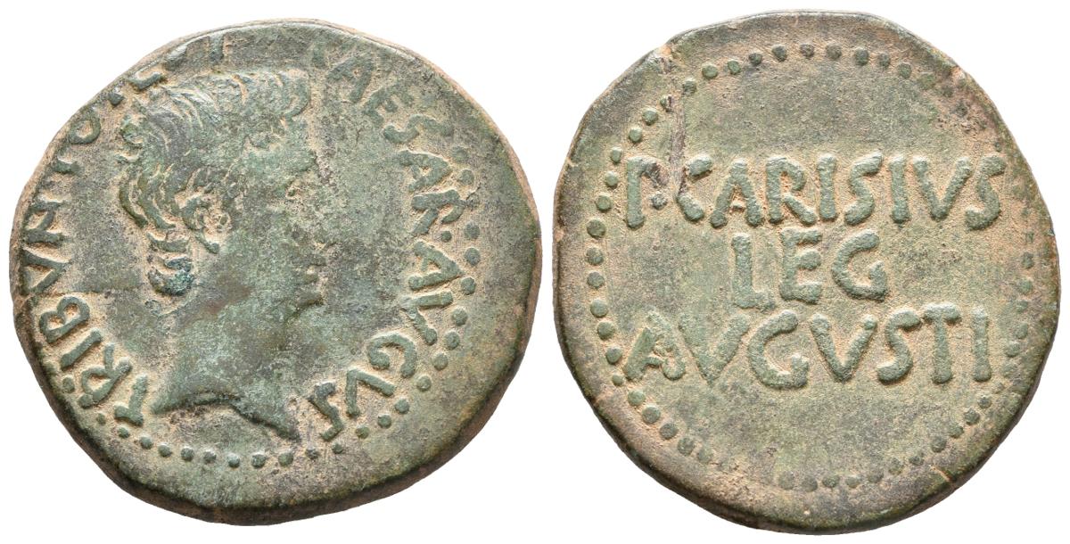 EMERITA AUGUSTA (Mérida, Badajoz). As. (Ae. 11,15g/28mm). 27 a.C. (FAB-986). Anv: Cabeza de Augusto a derecha, alrededor leyenda: CAESAR AVGVS TRIBVN POTEST. Rev: Leyenda: P CARISIVS LEG AVGVSTI. MBC+. Pátina verde.