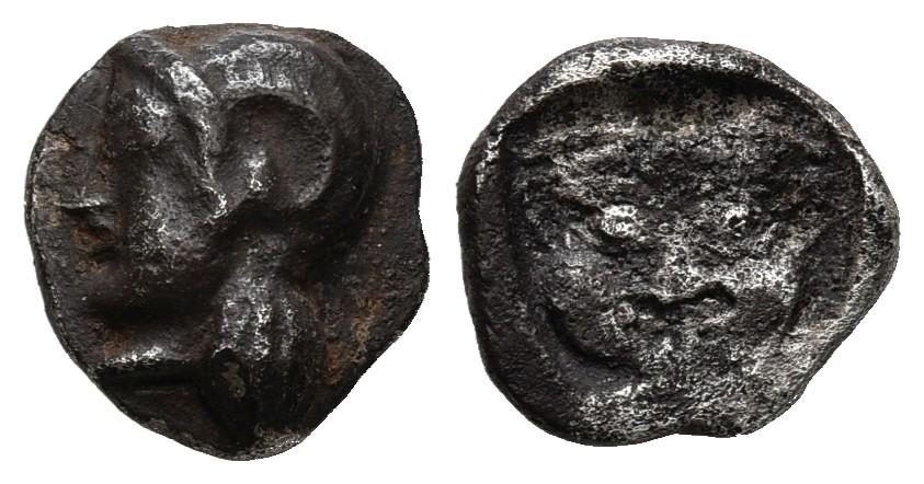 EMPORION (Ampurias, Gerona). Obolo. (Ar. 0,96g/10mm). Siglo V a.C. (ca.). (ACIP 41). Anv: Cabeza de ¿Atenea? con casco a izquierda. Rev: Cabeza de Gorgona de frente. MBC. Muy raro.