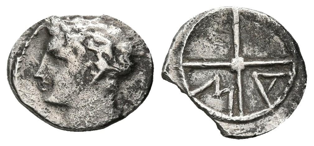 DIVISORES DE IMITACION DE MASSALIA. Trietartemorion. (Ar. 0,55g/10mm). 200-110 a.C. (FAB-1181). Anv: Cabeza masculina a izquierda. Rev: Rueda de cuatro ruedas, en el 3º y 4º cuadrante letras: M-A. MBC. Cospel faltado.