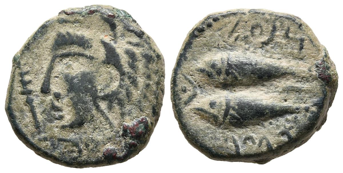 GADES (Cádiz). Semis. (Ae. 6,00g/19mm). 100-20 a.C. (FAB-1347). Anv: Cabeza de Hércules con piel de león a izquierda, delante clava. Rev: Dos atunes a izquierda, entre ellos creciente con punto y letra púnica alef, entre ambos leyenda púnica. MBC.