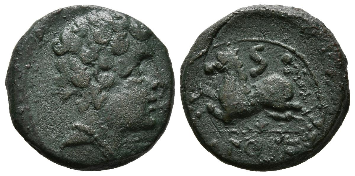 ICALCUNSCEN (Iniesta, Cuenca). Semis. (Ae. 3,93g/17mm). 120-20 a.C. (FAB-1419). Anv: Cabeza masculina a derecha. Rev: Caballo saltando a izquierda, encima S, debajo leyenda ibérica: ICaLCuNSCEN. MBC. Muy raro y más así.
