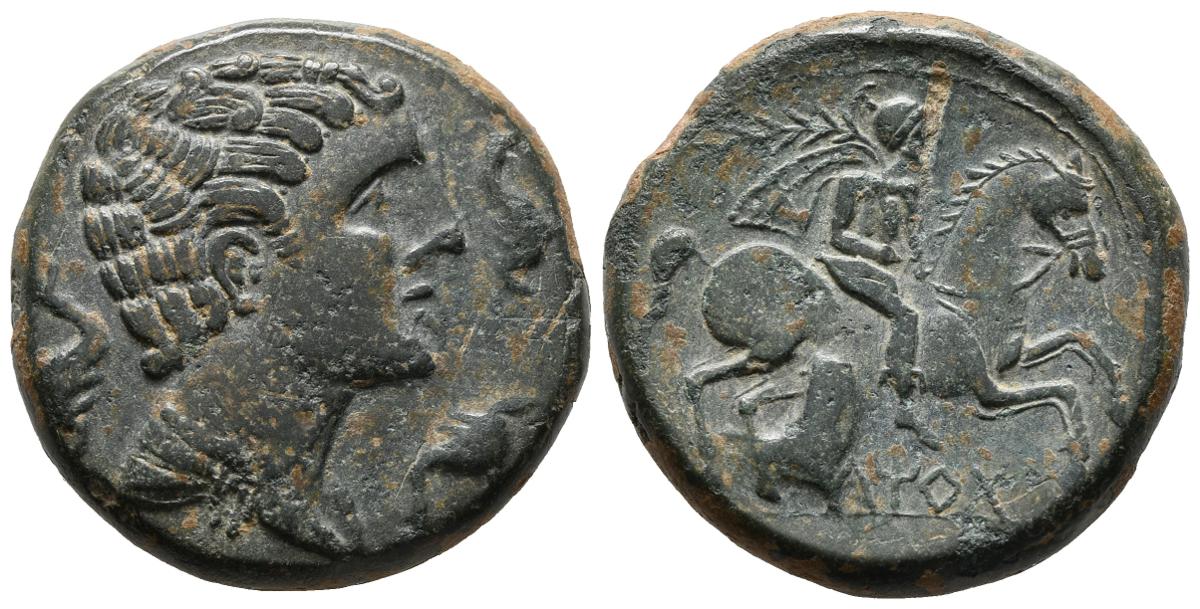 ILTIRTA (Lérida). As. (Ae. 20,02g/28mm). 220-200 a.C. (FAB-1465). Anv: Cabeza masculina a derecha rodeada de tres delfines. Rev: Jinete con palma a derecha, debajo leyenda ibérica sobre línea: ILTiRTa. EBC-. Bonito ejemplar.