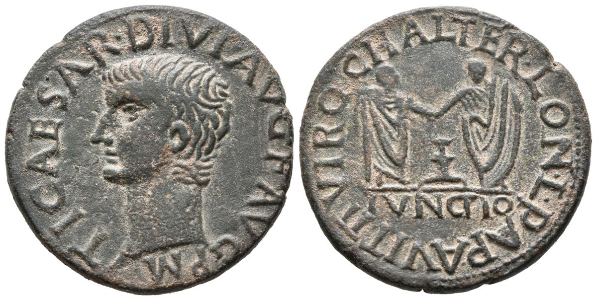 ILICI (Elche, Alicante). As. (Ae. 11,26g/28mm). 14-36 d.C. (FAB-1525). Anv: Cabeza de Tiberio a izquierda, alrededor leyenda: TI CAESAR DIVI AVG F AVG P M. Rev: Personajes togados, debajo IVNCTIO, alrededor leyenda: L TER LON L PAQ AVIT II VIR QCIIA. MBC+. Retocado.