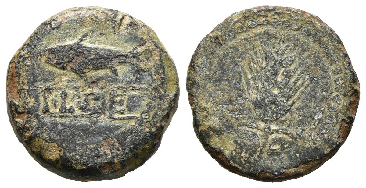 ILSE (Alcalá del Río, Sevilla). Sextante. (Ae. 3,27g/16mm). 120-20 a.C. (FAB-1555). Anv: Sábalo a izquierda, debajo leyenda: ILSE entre dos líneas. Rev: Espiga. MBC/MBC-. Muy escaso.