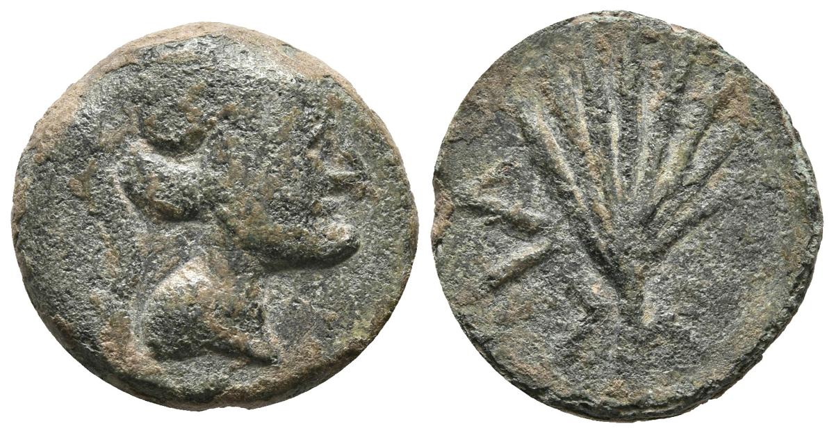 LAELIA (Olivares, Sevilla). Semis. (Ae. 4,92g/18mm). 50-20 a.C. (FAB-1651). Anv: Cabeza masculina con casco a derecha. Rev: Palma, debajo leyenda: LAELIA. MBC-.