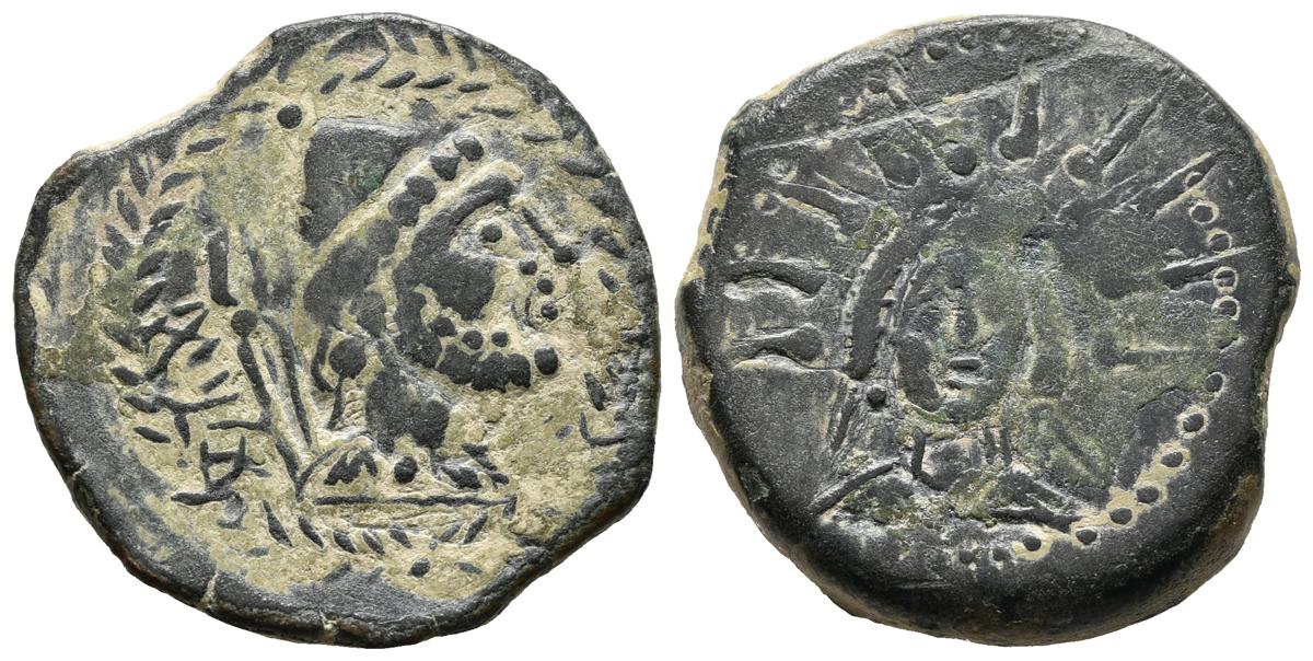 MALACA (Málaga). As. (Ae. 11,39g/27mm). 200-20 a.C. (FAB-1727). Anv: Cabeza de Vulcano a derecha, detrás tenazas y leyenda púnica tipo A. Rev: Cabeza de Helios de frente. MBC-.