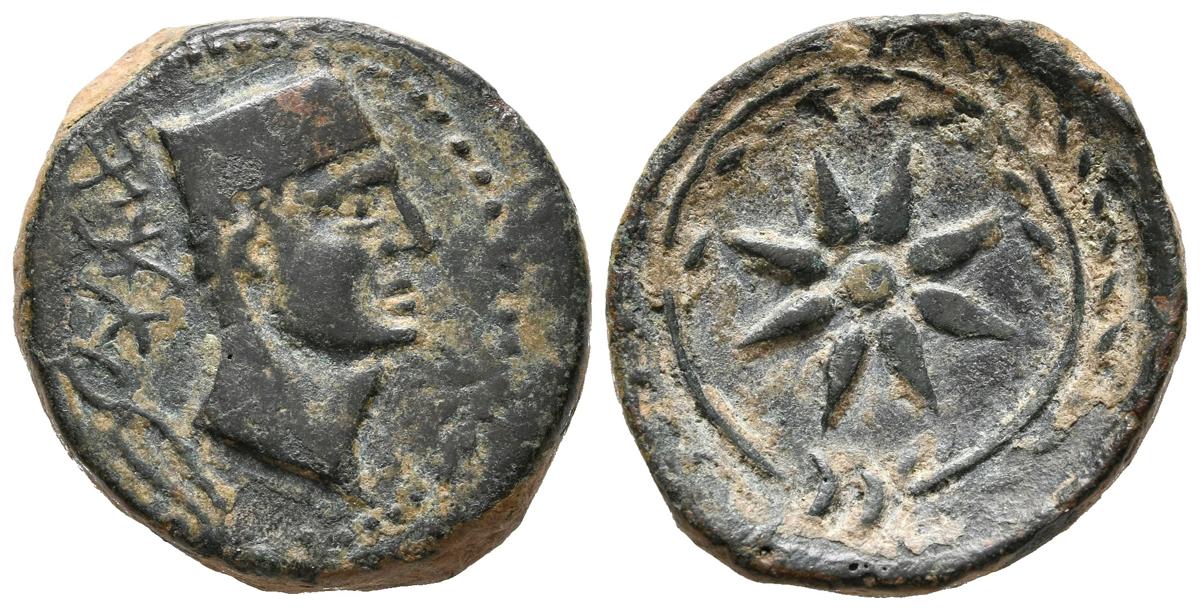 MALACA (Málaga). Semis. (Ae. 7,05g/18mm). 200-20 a.C. (FAB-1733). Anv: Cabeza de Vulcano con birrete plano a derecha, detrás leyenda púnica y tenazas. Rev: Estrella de ocho puntas dentro de láurea. MBC.