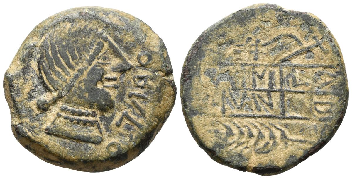 OBULCO (Porcuna, Jaén). As. (Ae. 14,94g/28mm). 220-20 a.C. (FAB-1807). Anv: Cabeza femenina a derecha, delante leyenda: OBVLCO. Rev: Espiga a derecha, debajo espiga a izquierda, entre ellos leyenda: L AIMIL/M IVNI/AID. MBC-.