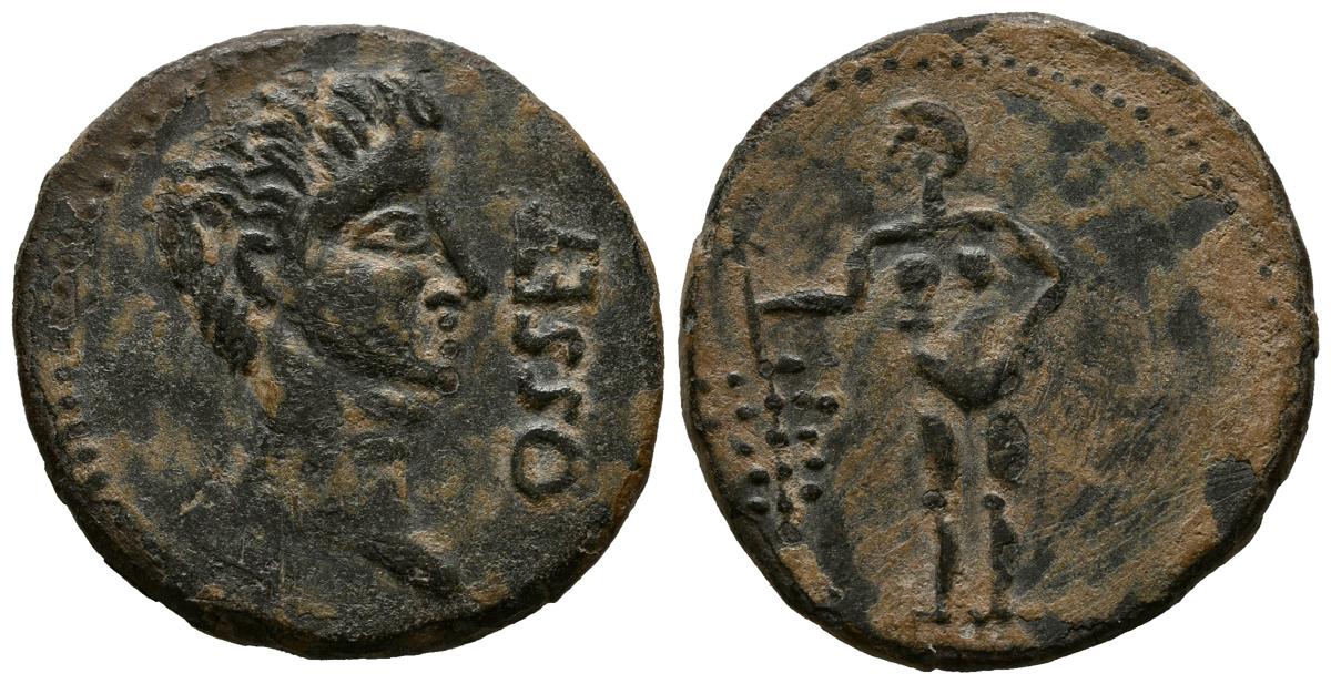 OSET (San Juan de Aznalfarache, Sevilla). As. (Ae. 7,78g/25mm). 120-20 a.C. (FAB-1949). Anv: Cabeza masculina a derecha, delante leyenda: OSSET. Rev: Genio estante a izquierda con racimo de uvas. MBC+.