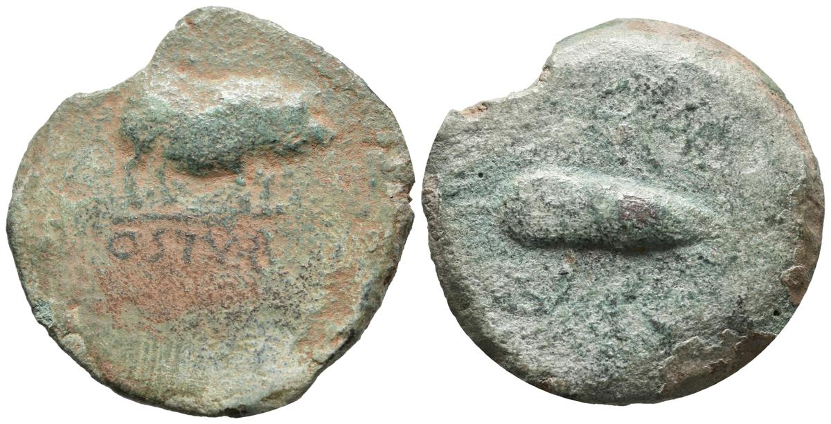 OSTUR (Zonza de Carmona, Sevilla). As. (Ae. 21,52g/33mm). 150-50 a.C. (FAB-1973). Anv: Jabalí a derecha, debajo de línea leyenda: OSTVR. Rev: Bellota entre dos espigas a derecha. BC+. Cospel faltado.