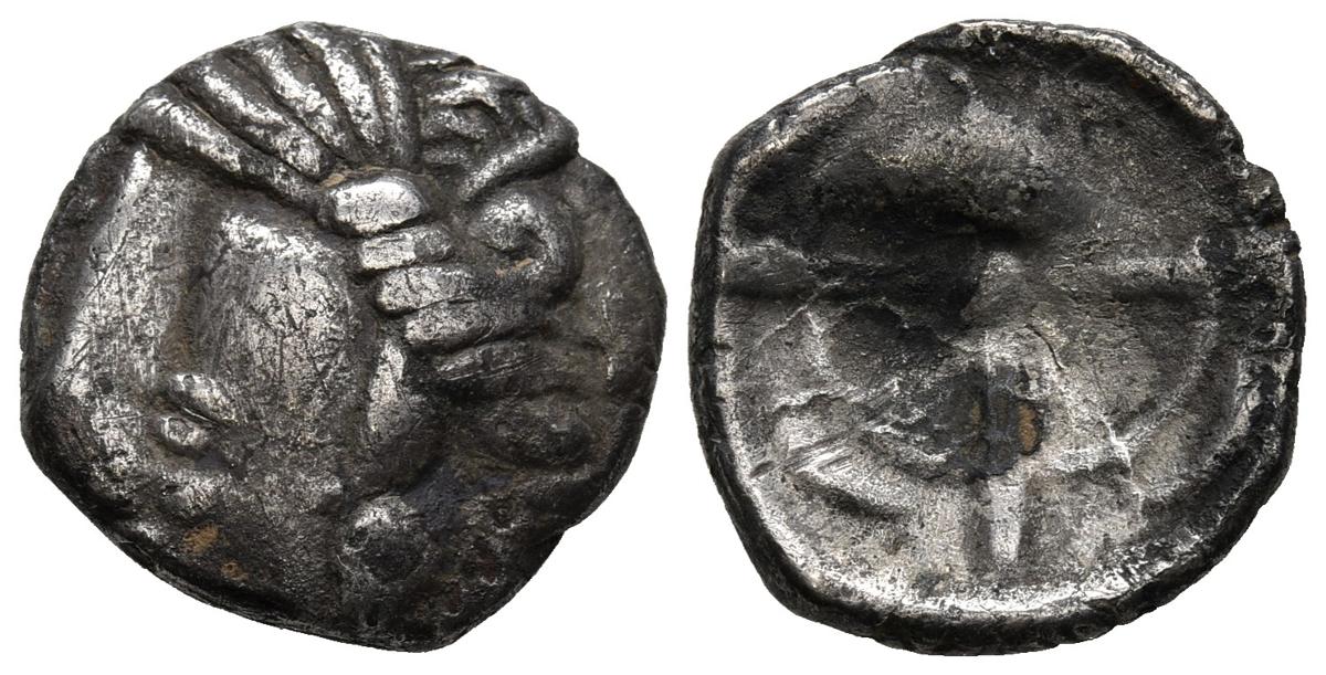 RODETON (Roses, Gerona). Dracma de imitación gala. (Ar. 4,30g/18mm). 250-195 a.C. (FAB-2011). Anv: Cabeza femenina a izquierda, de arte bárbaro. Rev: Rosa vista por debajo. MBC. Escaso.