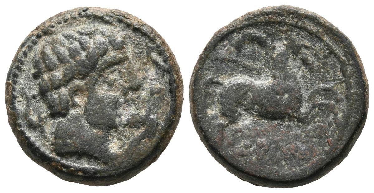 SALDUIE (Zaragoza). Semis. (Ae. 5,21g/17mm). 120-30 a.C. (FAB-308). Anv: Cabeza masculina a derecha rodeada de tres delfines. Rev: Caballo a derecha, encima creciente, debajo leyenda ibérica sobre línea: SALDuIE. MBC.