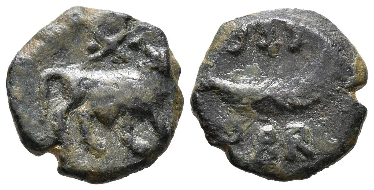 SEGOBRIGA (Saelices, Cuenca). Cuadrante. (Ae. 2,22g/15mm). 30-20 a.C. (FAB-2183). Anv: Toro a derecha, encima X entre dos puntos. Rev: Palma a derecha, alrededor leyenda: SEGOBR. MBC.