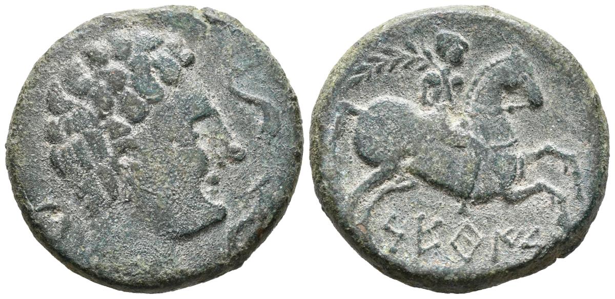 SETEIS (Sástago, Zaragoza). As. (Ae. 14,74g/28mm). 120-20 a.C. (FAB-2214). Anv: Cabeza masculina a derecha, delante dos delfines, detrás creciente. Rev: Jinete con palma a derecha, debajo leyenda: SETeIS. MBC. Pátina artificial.