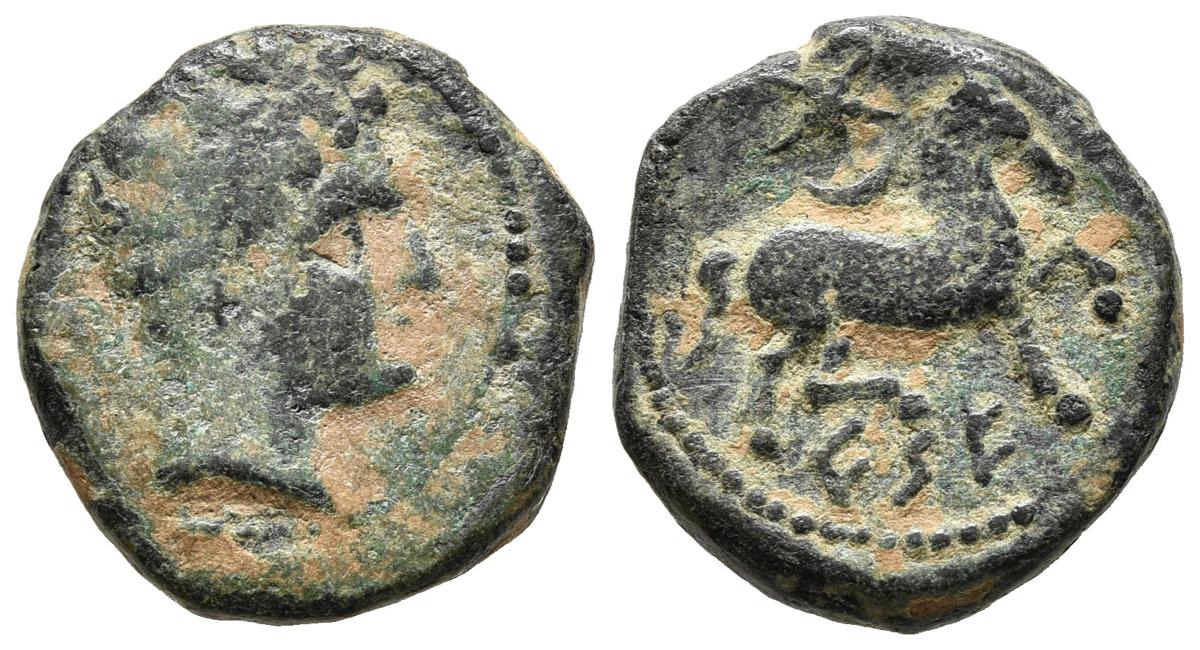 CESE (Tarragona). Semis. (Ae. 6,23g/20mm). 120-20 a.C. (FAB-2301). Anv: Cabeza masculina a derecha. Rev: Caballo al paso a derecha, encima estrella con creciente, debajo leyenda ibérica: CeSE. MBC-.