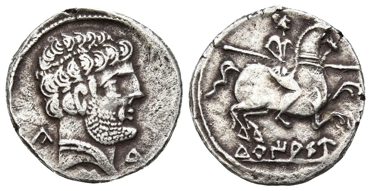 TURIASO (Tarazona, Zaragoza). Denario. (Ar. 3,86g/19mm). 120-20 a.C. (FAB-2417). Anv: Cabeza masculina barbada a derecha, detrás letra: CA, debajo: S y delante: Tu. Rev: Jinete con lanza a derecha, debajo leyenda ibérica sobre línea: TuRIASU. MBC.