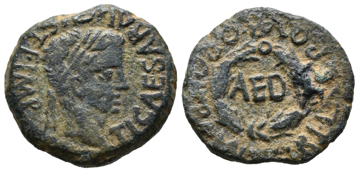 TURIASO (Tarazona, Zaragoza). Semis. (Ae. 5,81g/22mm). 14-36 d.C. (FAB-2458). Anv: Cabeza laureada de Tiberio a derecha, alrededor leyenda: TI AVGVSTVS AVGVSTI F IMP. Rev: Laurea, dentro: AED, alrededor leyenda: T SVLP Q PONT PLA MVN TVRI. MBC.