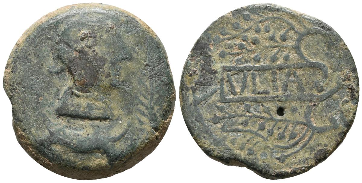 ULIA (Montemayor, Córdoba). As. (Ae. 21,72g/32mm). 50 a.C. (FAB-2490). Anv: Cabeza femenina a derecha, delnate palma, debajo creciente. Rev: Ramas de Vid alrededor de cartela con leyenda: VLIA. BC+/MBC-.