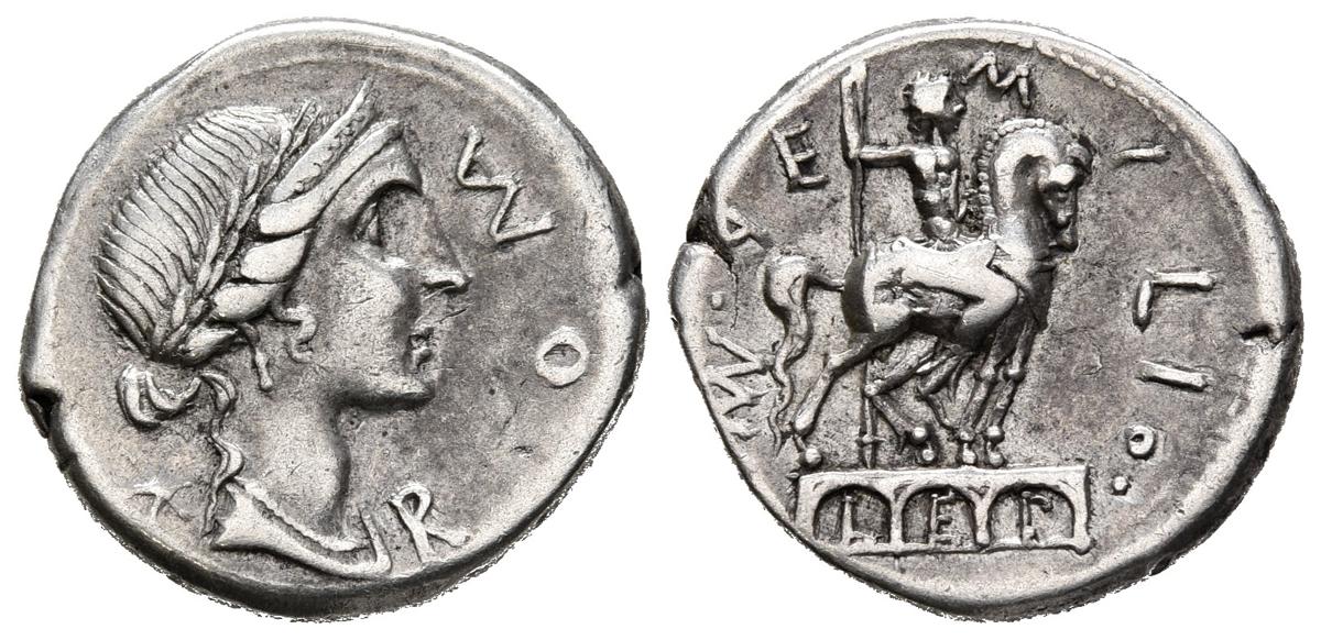 GENS AEMILIA. Denario. (Ar. 3,84g/19mm). 114-113 a.C. Roma. (FFC 103; Crawford 291/1). Anv: Cabeza laureada de Roma a derecha, detrás estrella, delante leyenda: ROMA. Rev: Estatua ecuestre a derecha sobre tres arcos, dentro de ellos: LEP, alrededor leyenda: MN AEMILIO. MBC.