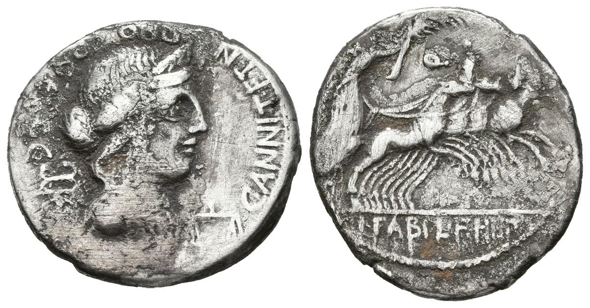 GENS ANNIA. Denario. (Ar. 3,85g/20mm). 82-81 a.C. Hispania. (FFC 138; Crawford 366/1a). Anv: Busto diademado de Anna Perenna a derecha, delante escalas, detrás caduceo, debajo símbolo, alrededor leyenda: C ANNI TFTN PRO COS EX SC. Rev: Victoria con palma en cuádriga a derecha, encima Q, en exergo: L FABI LF HISP. MBC.
