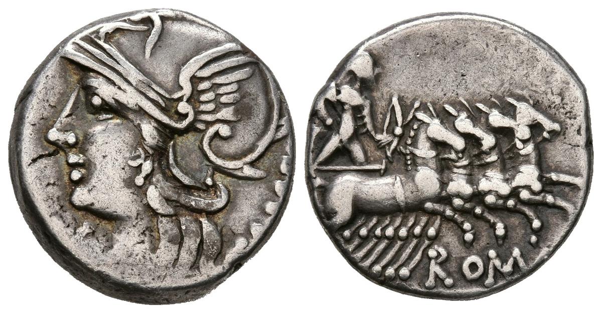 GENS BAEBIA. Denario. (Ar. 3,80g/17mm). 137 a.C. Roma. (Crawford 236/1a; FFC 198). Anv: Cabeza de Roma a derecha, delante: X, detrás leyenda: TAMPIL. Rev: Apolo conduciendo cuádriga, debajo: ROMA, en exergo: M BAEBI Q F. MBC.