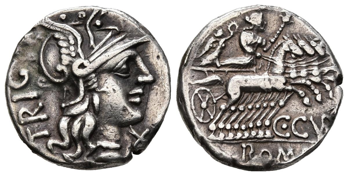 GENS CURIATIA. Denario. (Ar. 3,86g/18mm). 135 a.C. Roma. (FFC 667; Crawford 240/1a). Anv: Cabeza de Roma a derecha, delante X, detrás leyenda: TRIG. Rev: Juno con cetro en cuádriga a derecha coronado por Victoria, debajo leyenda: C CVRF, en exergo: ROMA. MBC.