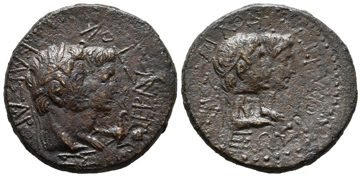 RHOEMETALKES I y PYTODORIS con AUGUSTO y LIVIA. Ae28. (Ae. 11,65g/28mm). 11 a.C.-12 d.C. (RPC 1710). Anv: Cabezas de Rhoemetalkes I y Pythodoris a derecha, delante capricornio, alrededor leyenda griega. Rev: Cabezas de Augusto y Livia a derecha, alrededor leyenda griega. MBC. Contramarca en reverso.