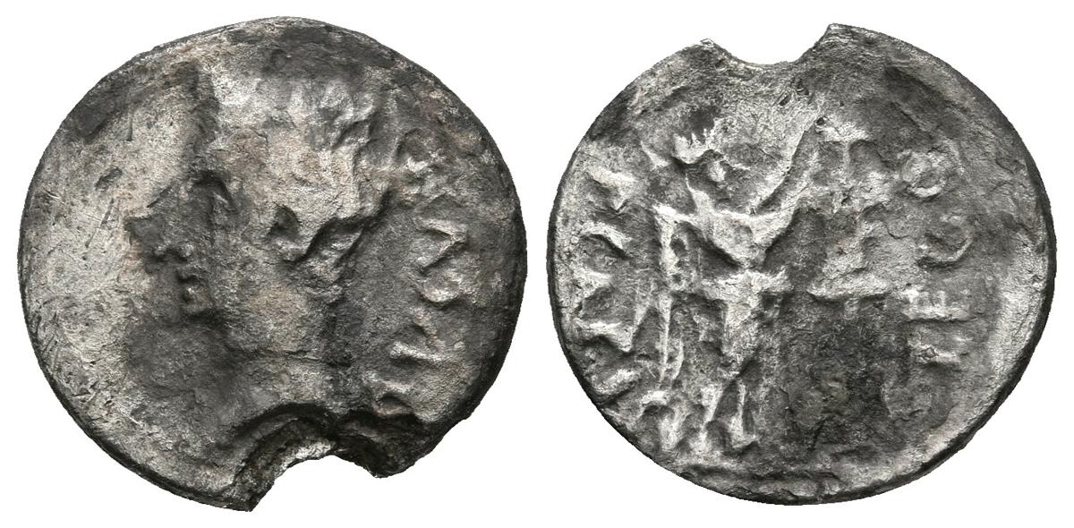 AUGUSTO. Quinario. (Ar. 1,41g/14mm). 25-23 a.C. Emérita Augusta. (RIC 1b). Anv: Cabeza de Augusto a izquierda, detrás leyenda: AVGVSTVS. Rev: Victoria estante a derecha coronando trofeo, alrededor leyenda: P CARISI LEG. MBC-. Cospel faltado.