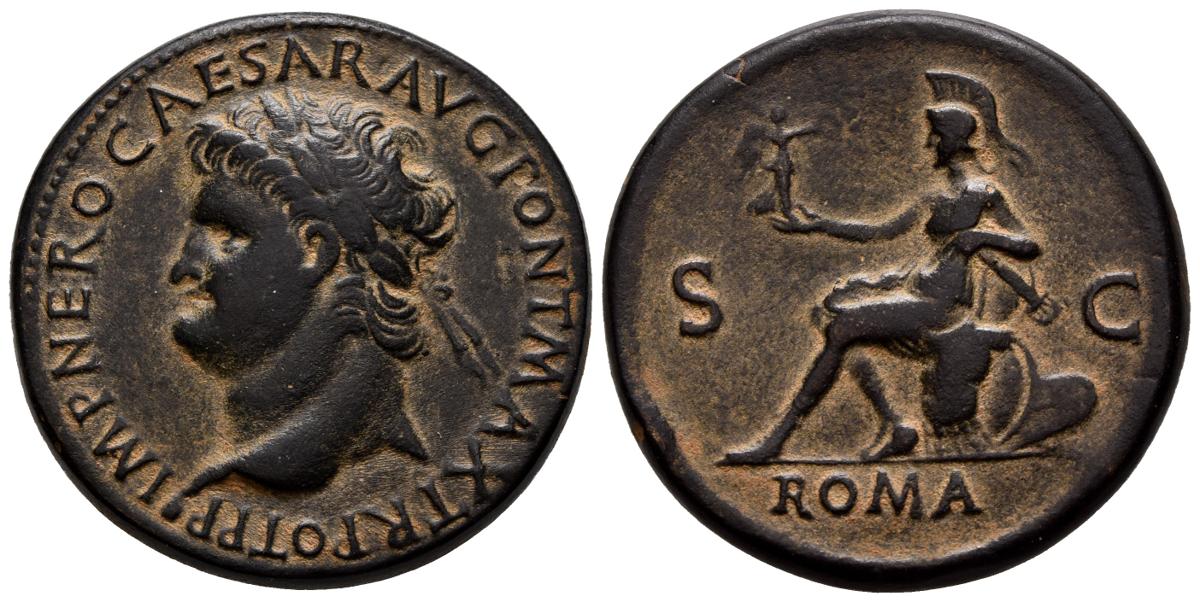 NERON. Sestercio. (Ae. 25,00g/32mm). 66 d.C. Lugdunum. (RIC 517). Anv: Cabeza laureada de Nerón a izquierda, alrededor leyenda: IMP NERO CAESAR AVG PONT MAX TR POT P P. Rev: Roma sentada a izquierda sobre coraza portando Victoria y parazonium, entre S-C, en exergo: ROMA. MBC+. Escaso.